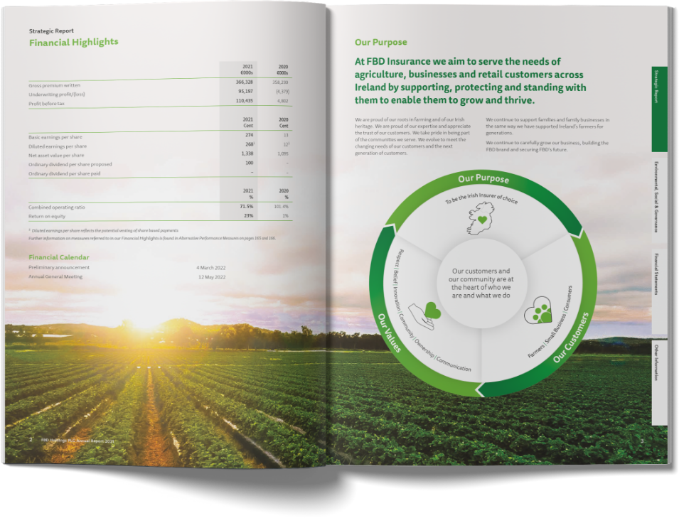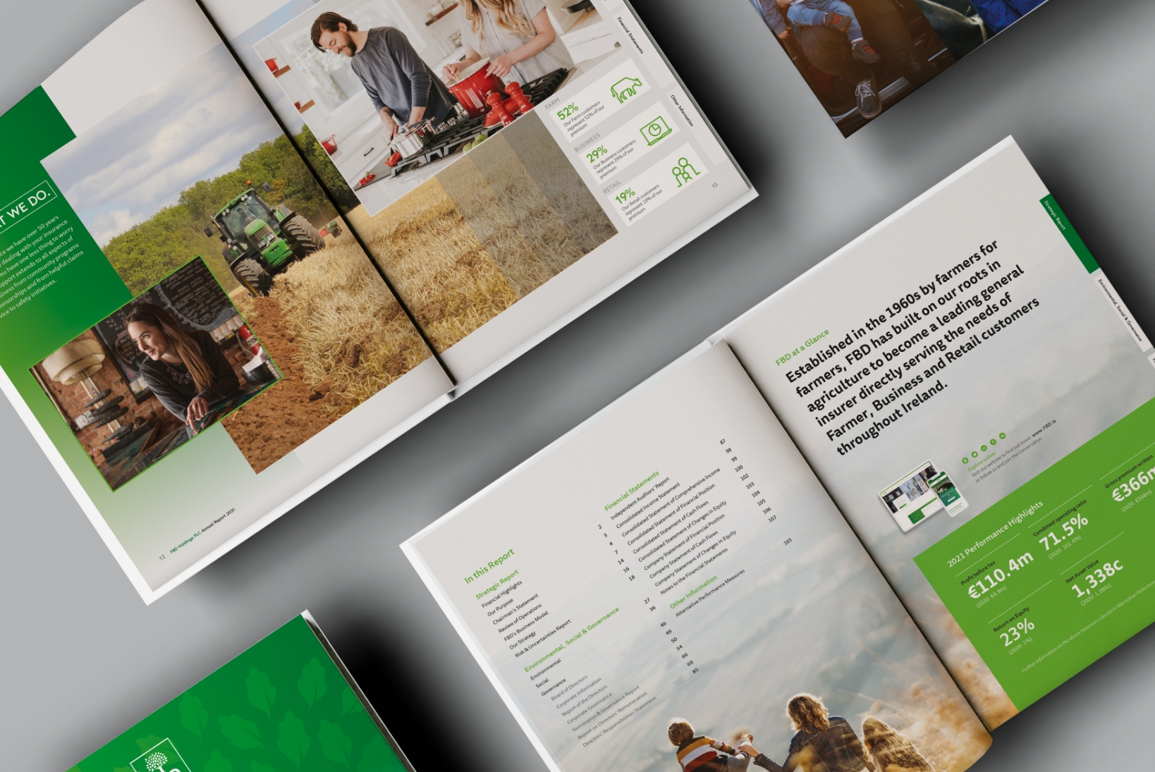 Fabrik and FBD have formed a close collaboration in recent years to transform FBD’s annual report. The main objective of this partnership has been to establish FBD as the leading insurance provider in the Irish market. Our key focus has been developing a report that effectively conveys FBD’s organisational structure, values, and clients through the use of imagery and infographics.